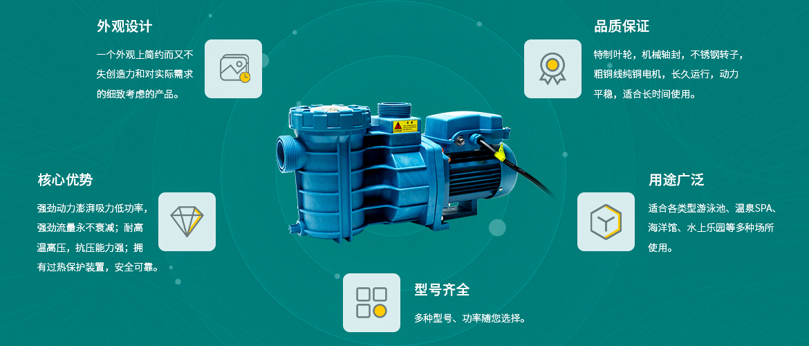 The ABS series water pump has an innovative internal design and large self-suction. The pump body is made of special materials and can bear pressure of 6kg/cm². It can be used at 70℃ high temperature. It is used in swimming pools, hot springs SPA, aquariums, water parks and other places.
